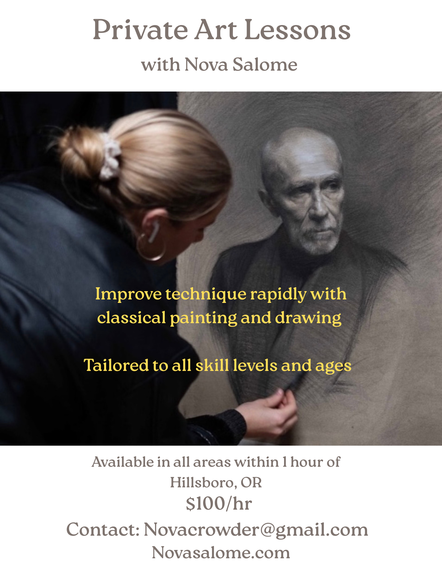 Nova Salome is a classically trained fine artist offering in home and outdoor private art lessons, available to those within one hour of Hillsboro Oregon. Available in the medium of your choice, from drawing to painting. Instruction is personalized to your level and interests, with a focus on but not confined to classical methods, conversations around ones creative process and refinement of technique. Students are responsible for their own materials, but will recieve thorough guidance on what to use.